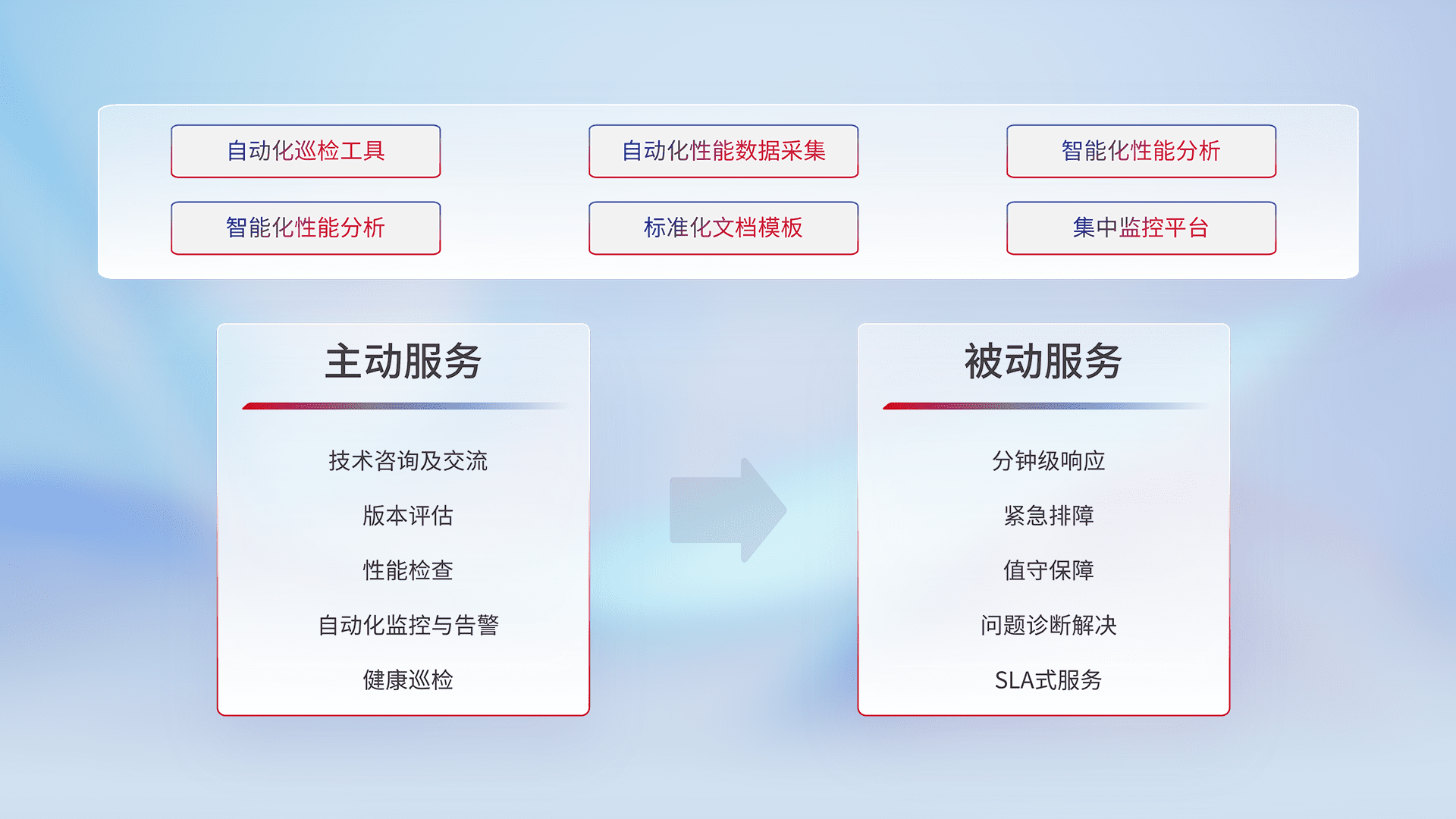 智能化工具和标准化文档,,,保障服务质量,,,,提供主动服务(包含技术咨询、、、、版本评估、、、、性能检查、、、自动化监控与告警、、健康巡检)和被动服务包含(分钟级响应、、、紧急排障、、、、值守保障、、、问题诊断解决、、、、SLA服务)。。